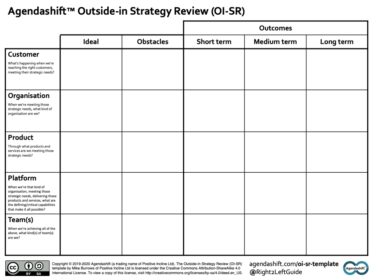 For the purposes of this exercise, a circle is defined only loosely, as a self-governing group of people responsible for a domain, business, technical, functional, geographical, or whatever. For stronger definitions, see Right to Left [2], We the People [3], and the Wikipedia page for Sociocracy [4]. Right to Left remains by the way the best source for our outside-in strategy review (OR-SR); the forthcoming Agendashift 2nd edition [5] covers it too but not in the same depth.