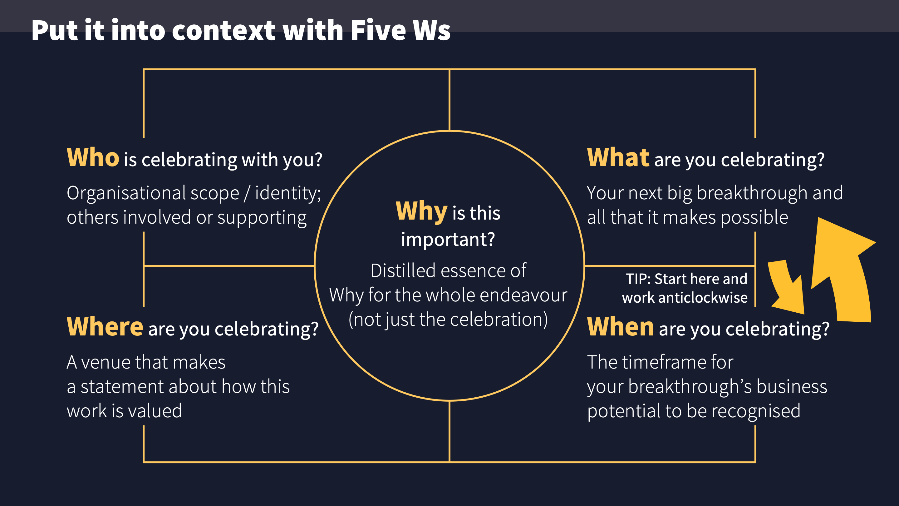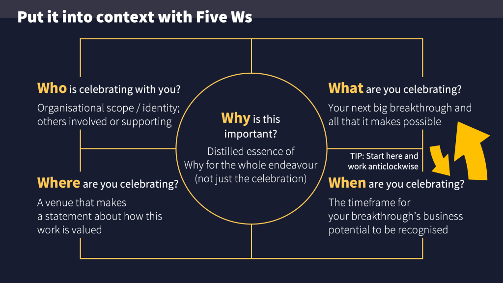 Before answering that question, a reminder of how it works. It’s in the genre of the time travel exercise, and its conceit is that you (by which I mean workshop participants) are using the journalistic 5W questions – Who, What, When, Where, Why – on the celebration you’re going to have when your next big breakthrough (one you haven’t made yet) is ready to be celebrated.
