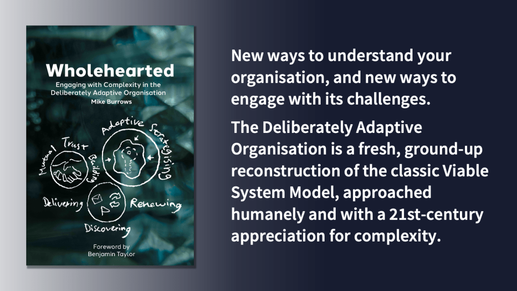 The Deliberately Adaptive Organisation made its first appearance in the final chapter of the Agendashift 2nd edition (2021). Although it drew some favourable comments at the time, I have to say that in Wholehearted, it has changed almost beyond recognition. You get to understand not only how organisations work (important if you want to understand their dysfunctions), you get to understand how they come to be what they are. There’s an idea there that can be taken further: how do organisations become what they are to each of their participants individually? If every experience of the organisation is different, how can we use that? Instead of glossing over those differences as the traditional modelling process must do, let’s recognise the vast untapped reserve of adaptive capability that they represent.