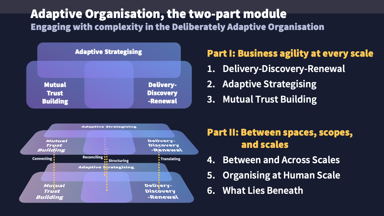 Part I develops the Deliberately Adaptive Organisation, a model to describe any organisational scope at any scale (or many/all such scopes all at once!). Part II pays attention to issues of scale:
